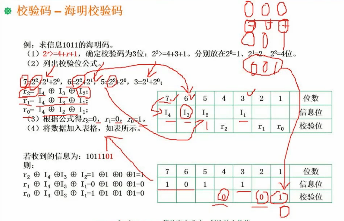 信息位化为二进制,涉及到的次方数就是对应校验位的 异或 内容,可以算出对应校验位的值,再带入表格 ,可以得到海明码: 1010101 。